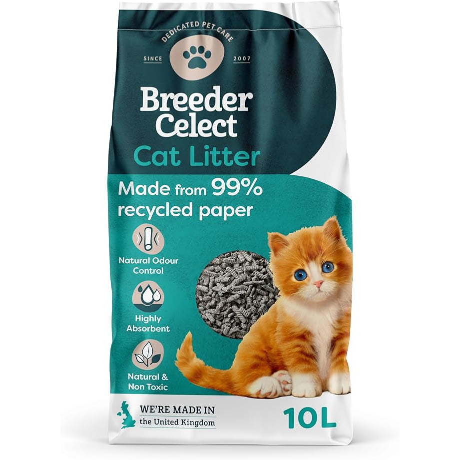 Breeder Celect Recycled Paper Pellet Cat Litter offers 99% recycled, eco-friendly litter with high absorbency, odour control, and softness for your cat’s comfort.