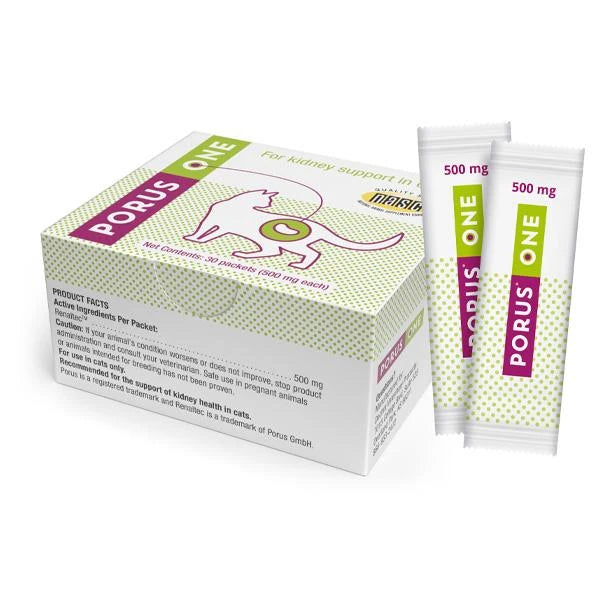 Dechra Porus One 500mg sachets are specially formulated to support feline kidney health by helping to manage the levels of toxins in the bloodstream. Ideal for cats with early signs of chronic kidney disease (CKD), Porus One binds protein waste products in the gut before they can burden the kidneys, promoting a healthier renal function and overall wellbeing.