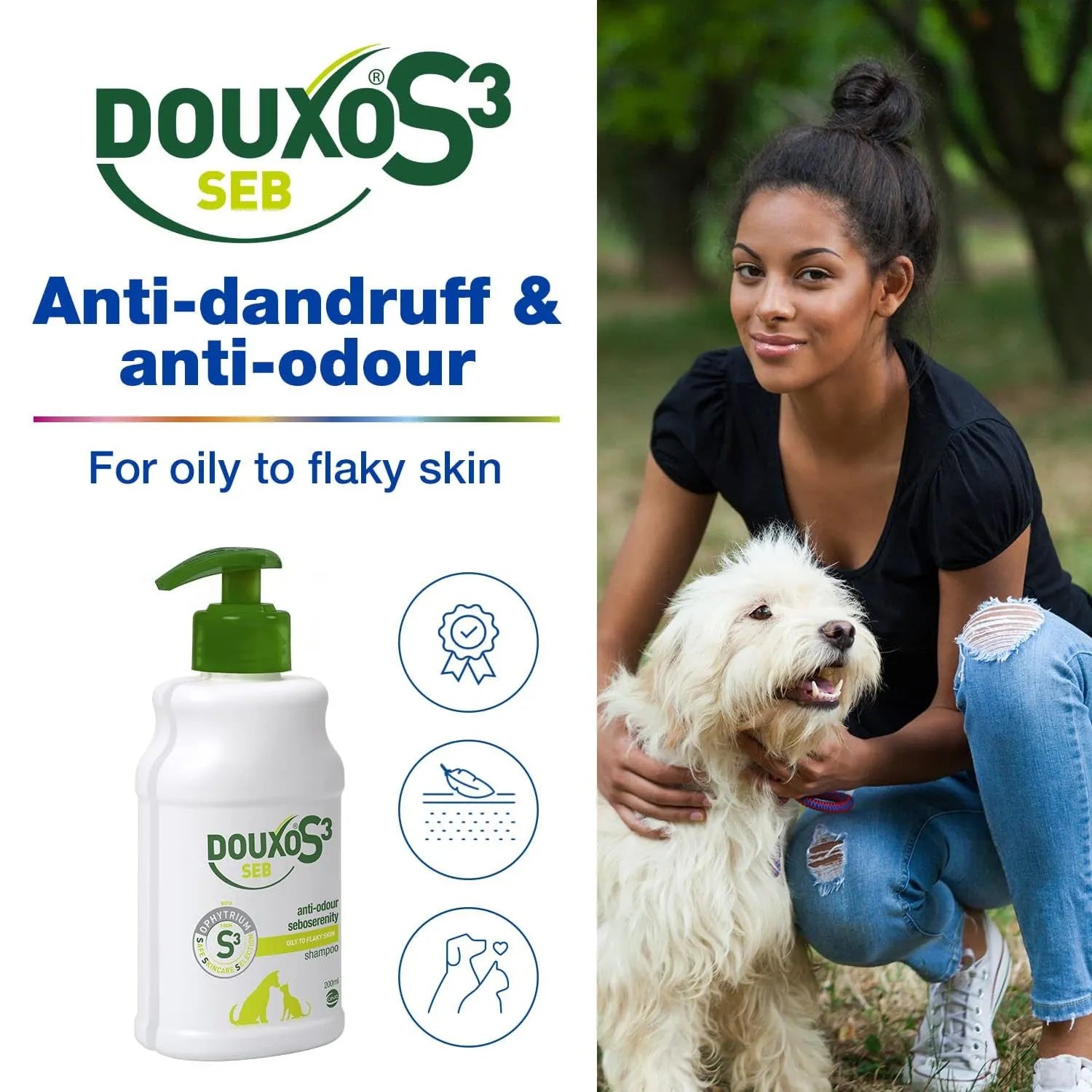 Douxo S3 SEB Shampoo is specially formulated to help manage oily, flaky, and scaly skin in dogs and cats. It regulates sebum production, removes excess oil and dandruff, and restores healthy skin balance with the help of Ophytrium and Seboliance.