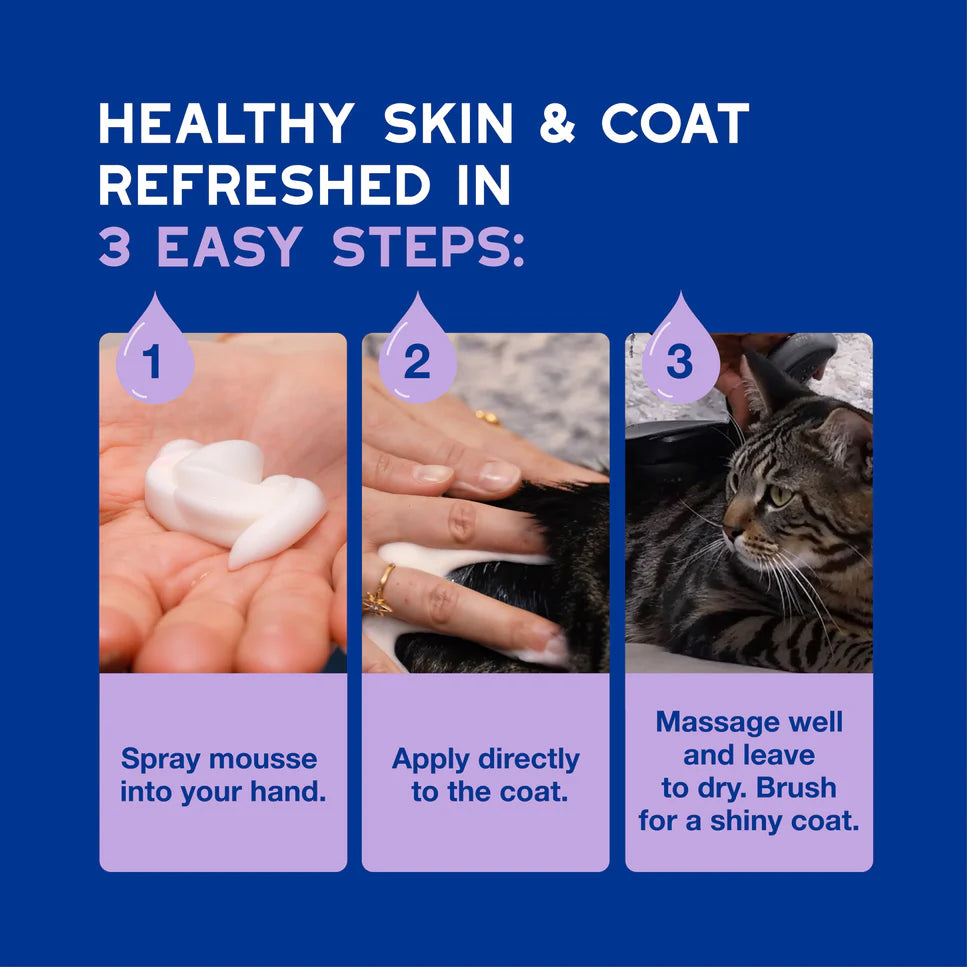 DOUXO® Refresh Leave-on Mousse for Cats 150ml is a no-rinse, vet-recommended mousse that cleanses, hydrates and deodorises your cat’s skin and coat. Ideal for cats who dislike bathing, with 98% natural ingredients and a fresh scent.