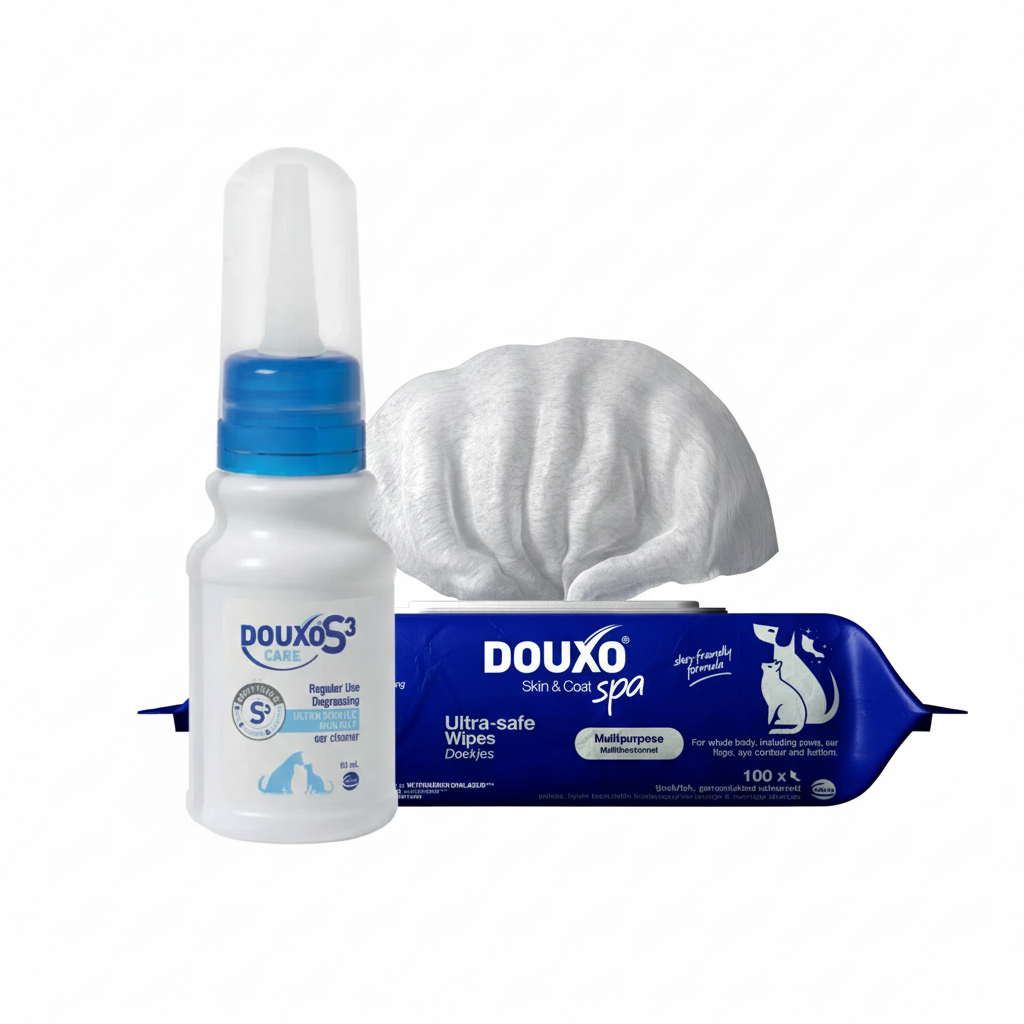 Gentle Ear Care for Dogs & Cats Bundle - Douxo S3 Ear Cleaner & Douxo SPA Grooming Wipes