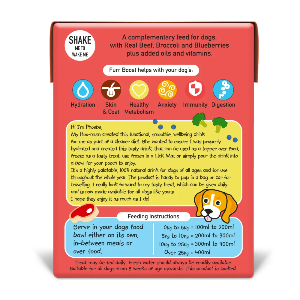 Furr Boost 400ml drinks are natural, vet-approved hydration boosters for dogs. Packed with real meat, fruit, and veggies, they support healthy digestion, skin, coat, and hydration. Perfect for fussy drinkers or post-walk refreshment. Grain-free, dairy-free, and irresistibly tasty!