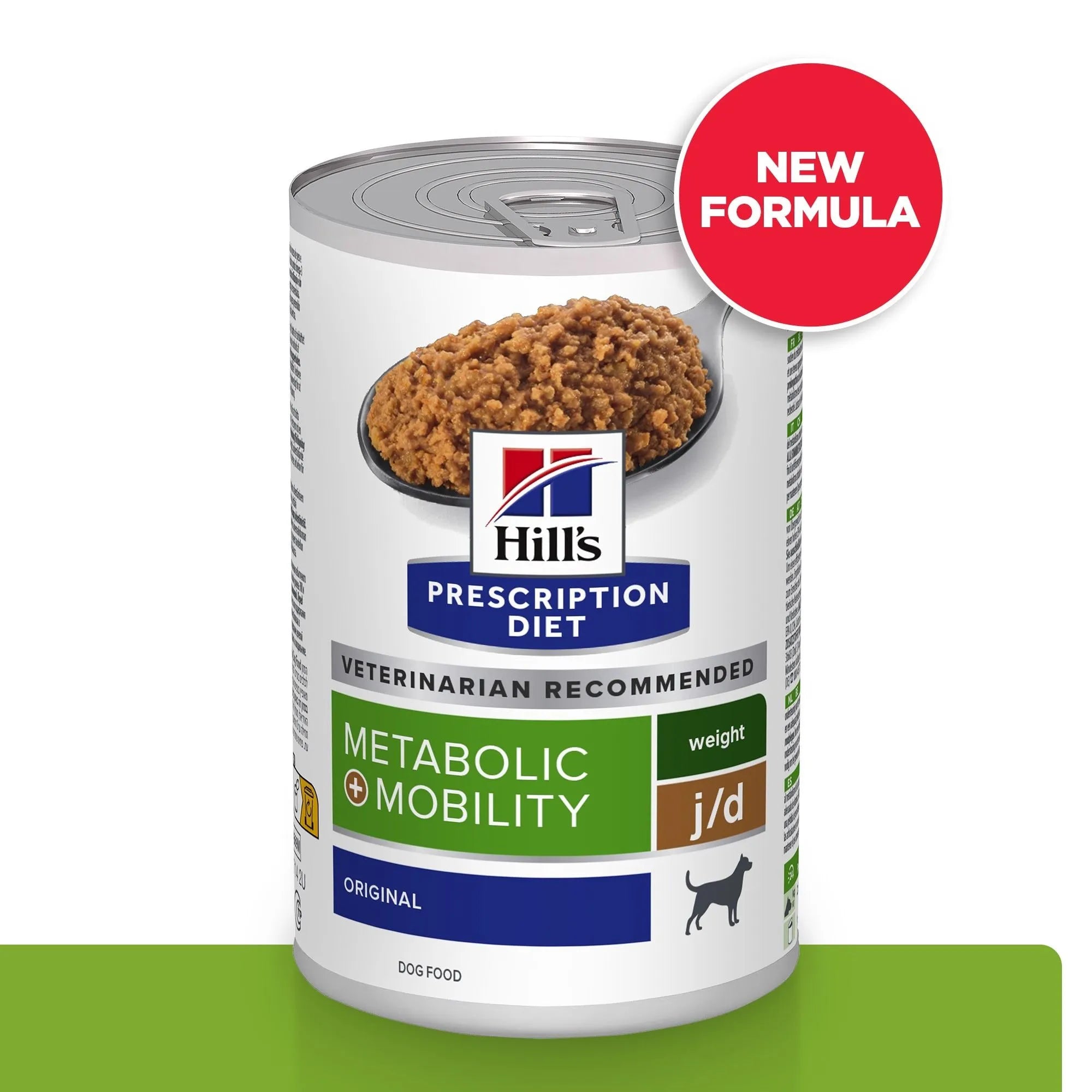 Hill's Prescription Diet Metabolic + Mobility Dog Food Cans support weight management and joint health in adult dogs.