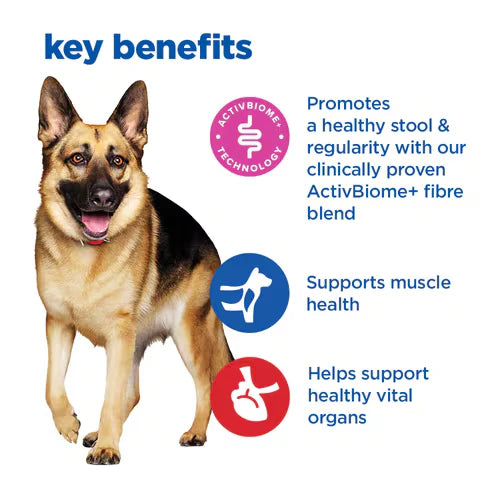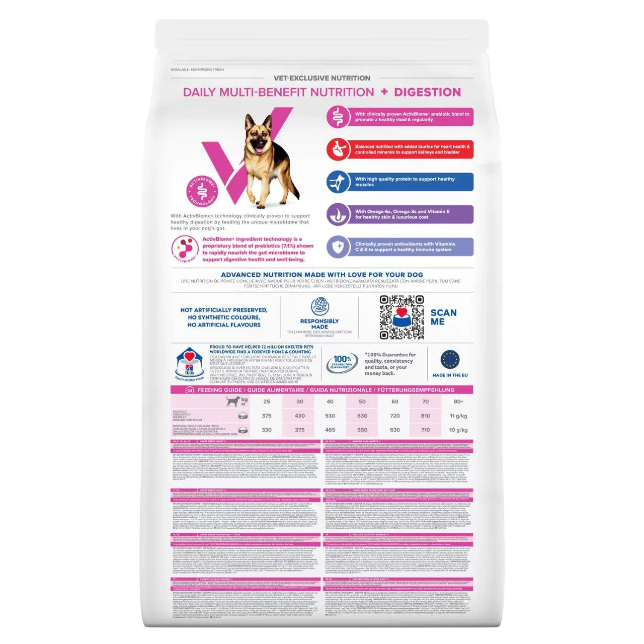 Hill's Vet Essentials Multi-Benefit + Digestion Adult Large Breed Dry Dog Food supports digestive health and overall well-being for large breed dogs.