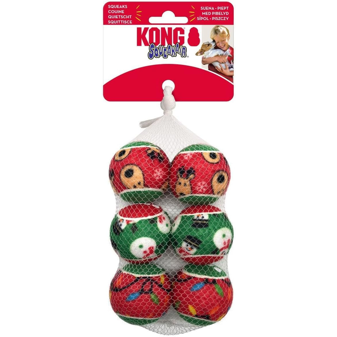 KONG Holiday SqueakAir Balls merge a squeaker and tennis ball into a festive fetching toy. Designed for safe, stimulating play with bright seasonal patterns.