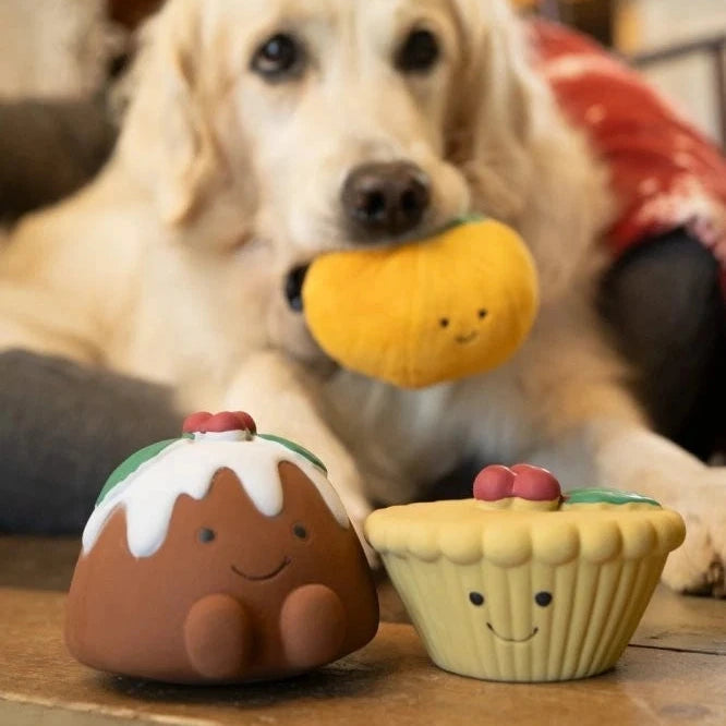 Festive Petface Chrissie Christmas Pudding Latex Dog Toy for dogs of all sizes.