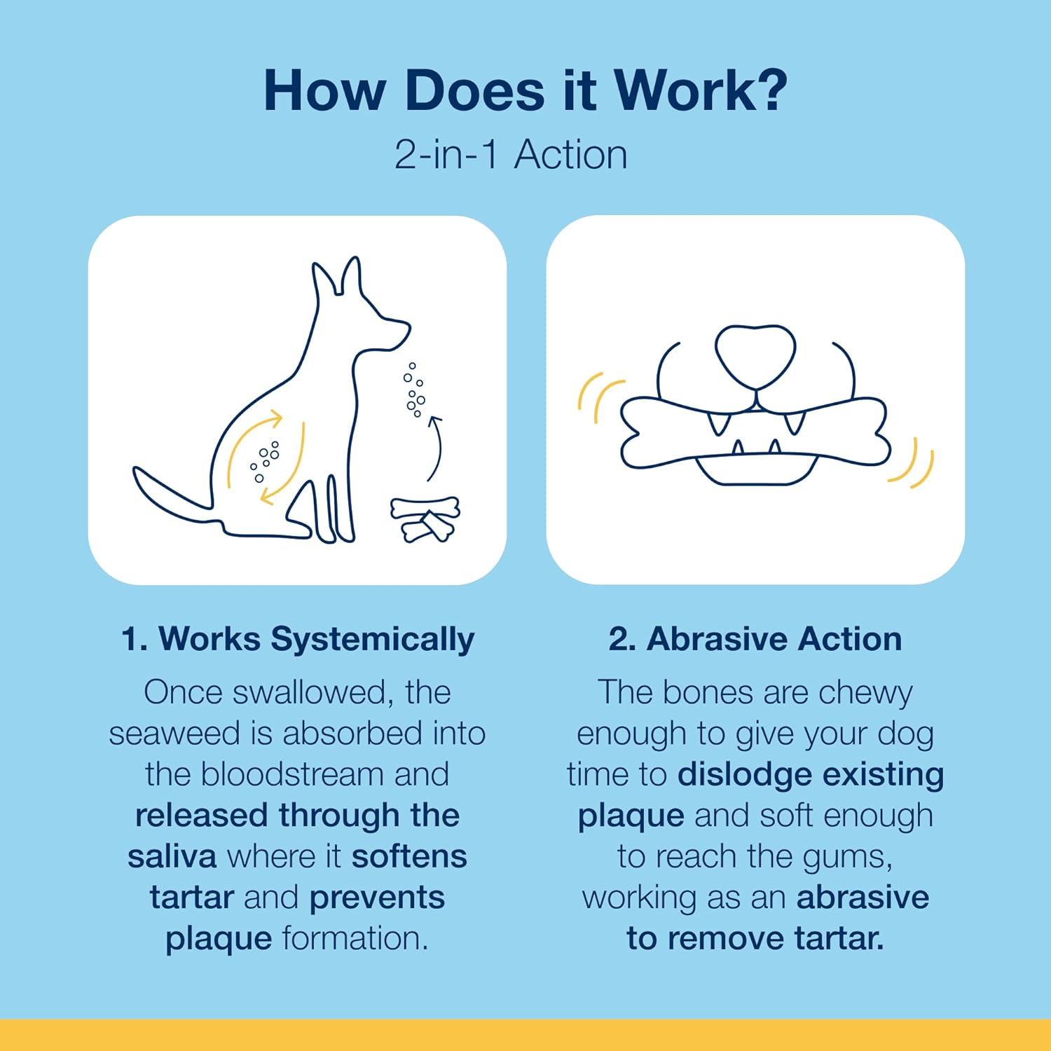 ProDen PlaqueOff Mini Bones are natural dental chews for small dogs. They contain a clinically proven kelp ingredient that helps reduce plaque and tartar, and improve bad breath. These chews also support immune health with omega 3 and 6 fatty acids and antioxidants.