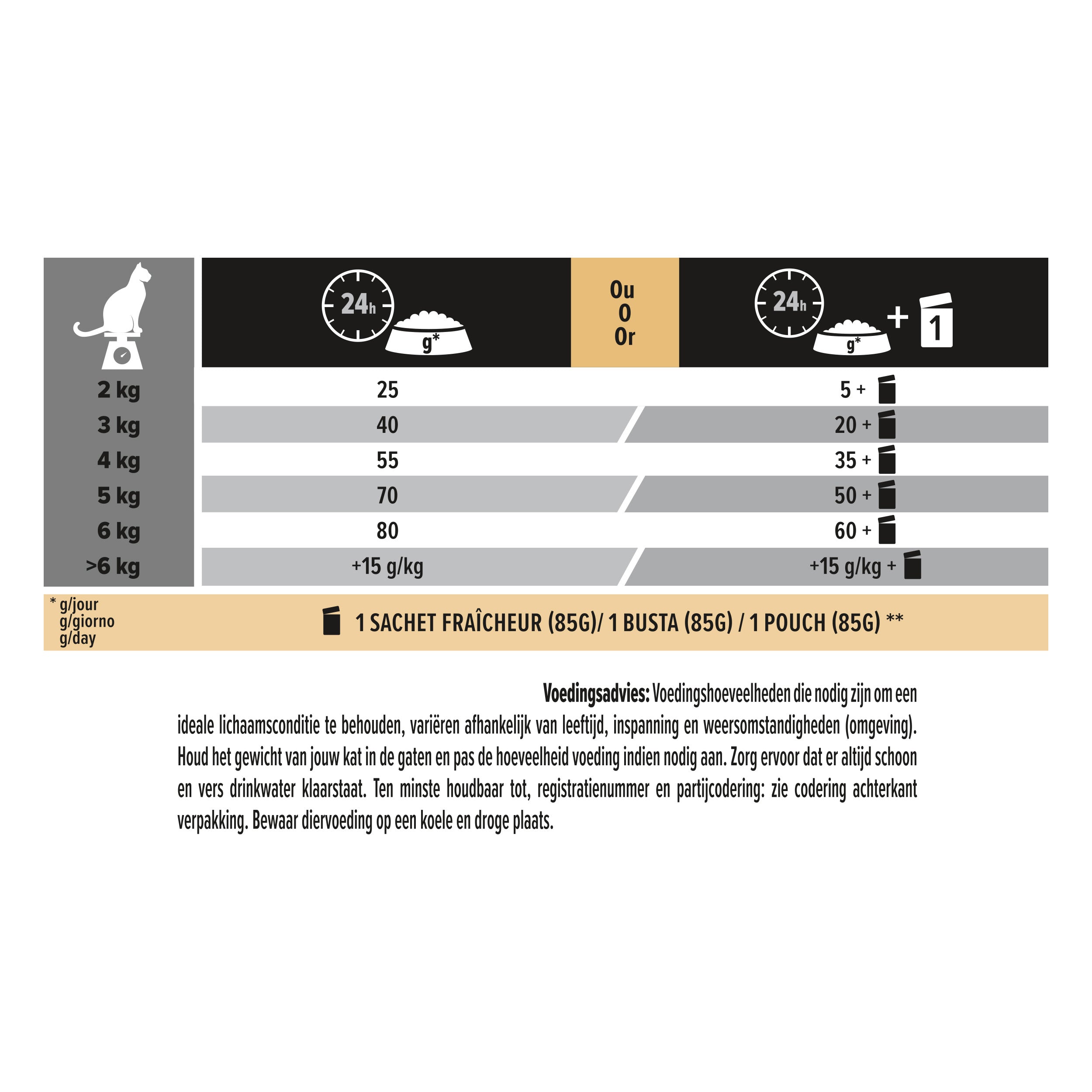 • Feed according to cat’s weight, age and activity