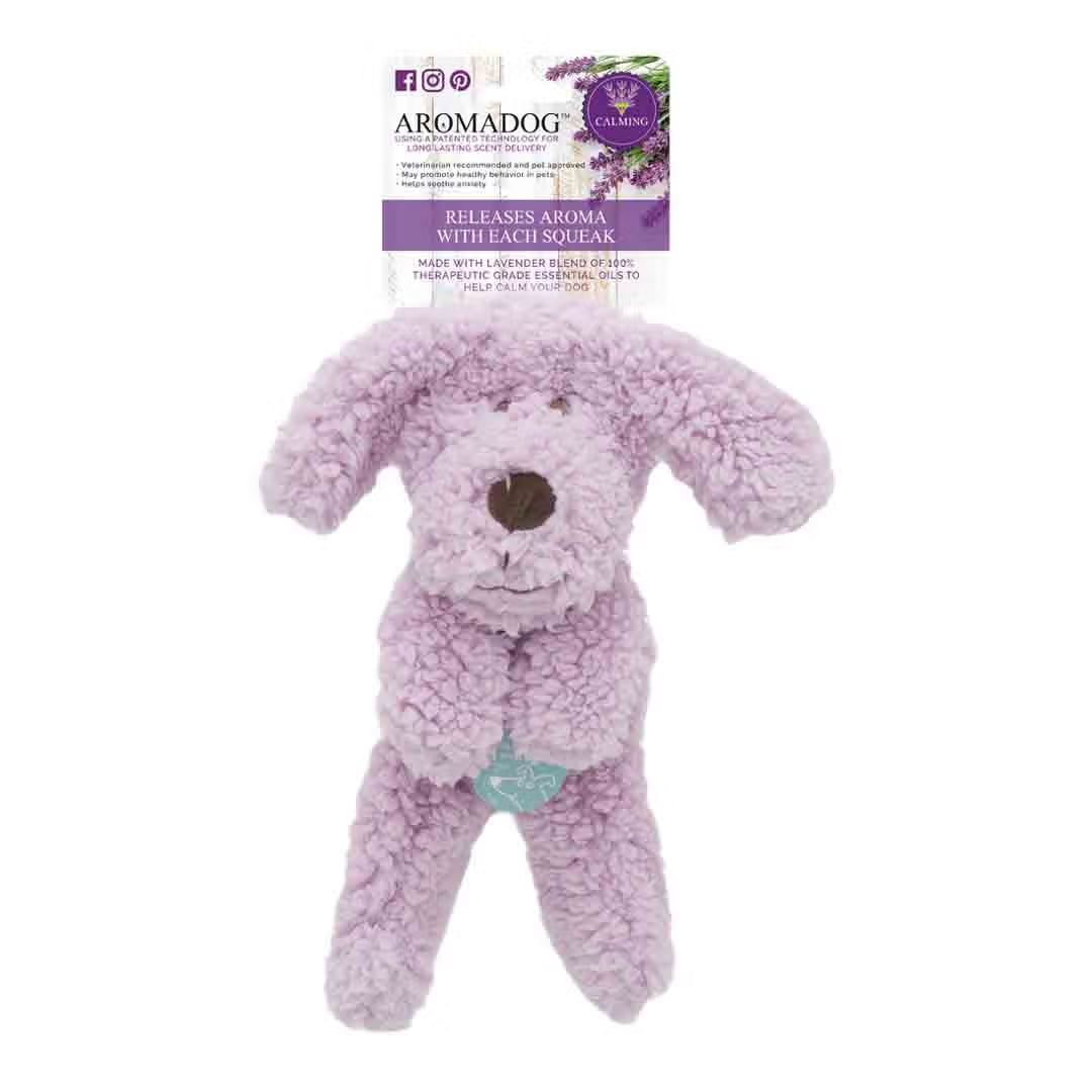 Aromadog Calm Fleece Flattie is a scented dog toy designed to help calm dogs by releasing soothing aromatherapy with every play.