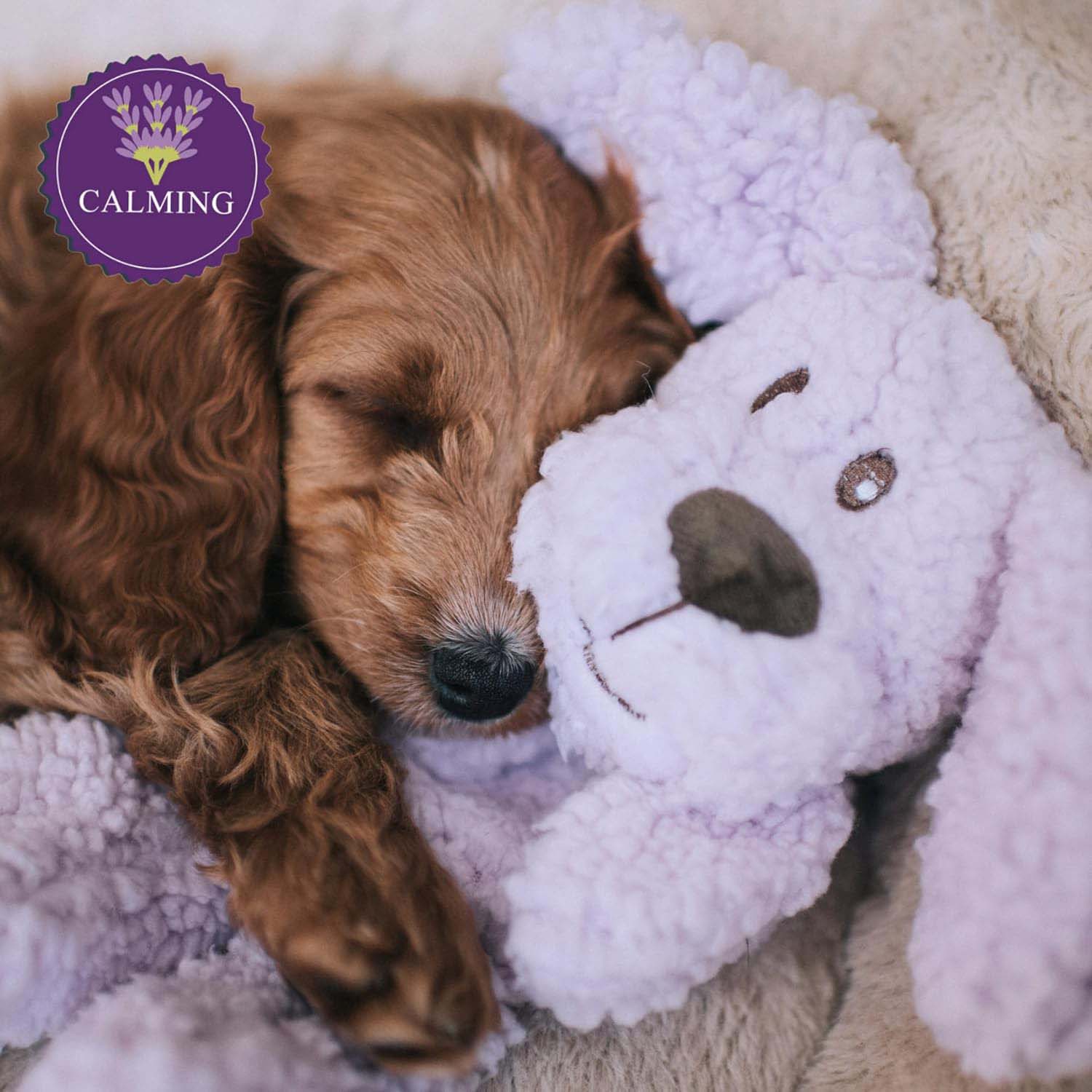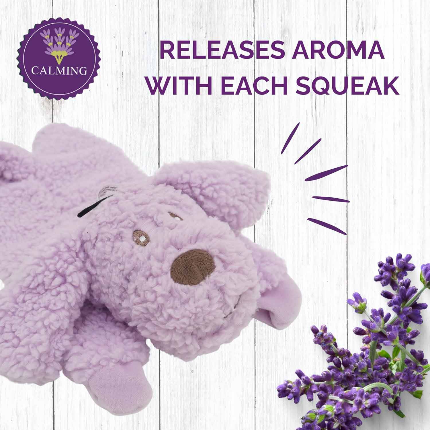 Aromadog Calm Fleece Laying Down is a soothing dog toy infused with calming essential oils to help relax anxious and hyperactive pets during play.