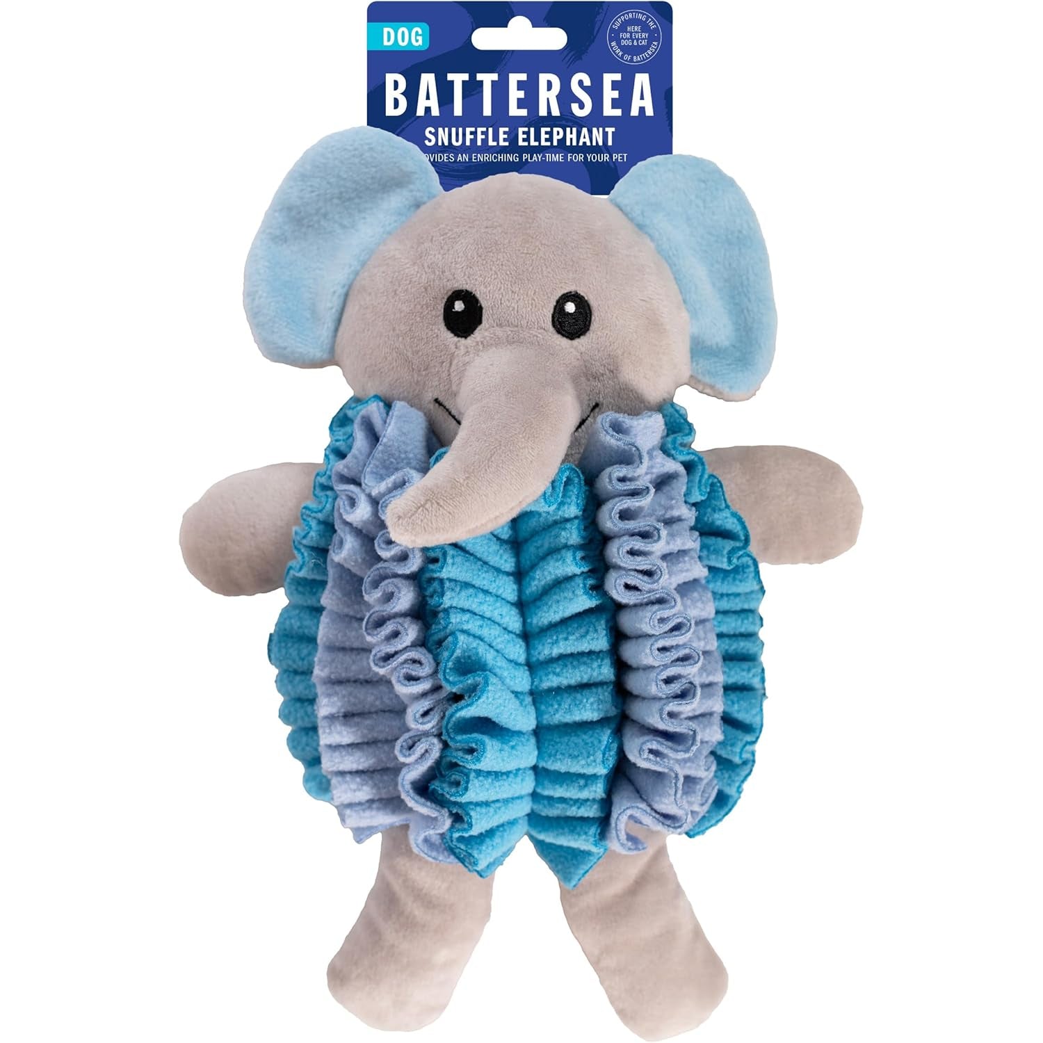Battersea Snuffle Elephant is a plush snuffle toy that encourages dogs to forage, sniff out hidden treats, and engage in enriching play that stimulates their natural instincts.",