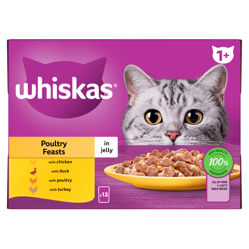 Whiskas 1+ Poultry Feasts in Jelly Adult Wet Cat Food is specially prepared to preserve the natural goodness and deliciousness of high quality ingredients. These favourite meals will see your cat rush to the bowl faster than ever before! Our tasty recipes are designed for contented purrs at every age, at mealtimes and beyond. Made with 100% high quality ingredients, this food is specially formulated to provide all of your 1+ cat's daily needs. It offers mouth-watering flavours and textures for maximum purrs, supports healthy digestion and immune function, and boasts 90% of its protein from animal sources with no added artificial colours or preservatives.